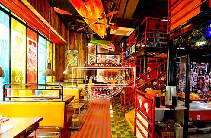 店內采用許多年輕元素,時尚活力涂鴉,餐廳處處充滿趣味格調和時尚新鮮感,給顧客營造一種輕松愉快的環境。在這吃火鍋你不用擔心油煙味,因為它選用了韓博智能無煙火鍋設備,節能、安全、高檔、環保,油煙去除率高達99%。